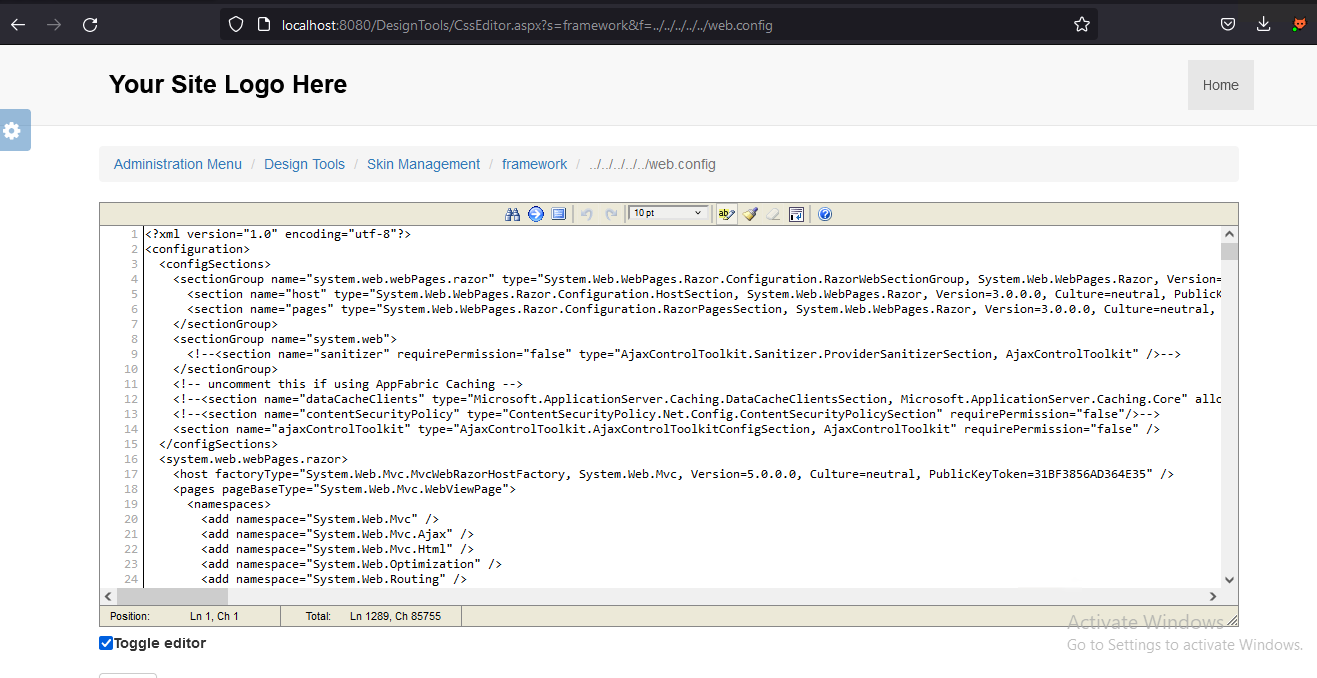Example of Vulnerable URL: /DesignTools/CssEditor.aspx?s=framework&f=../../../../../web.config